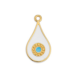 Retrouvez à la Perlerie ce pendentif en forme de goutte en zamak doré à l’or fin 24K recouvert de résine époxy blanche et bleue !